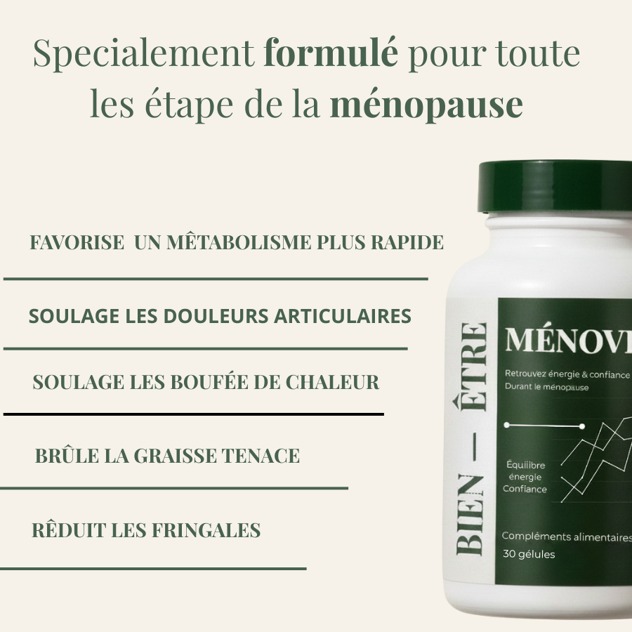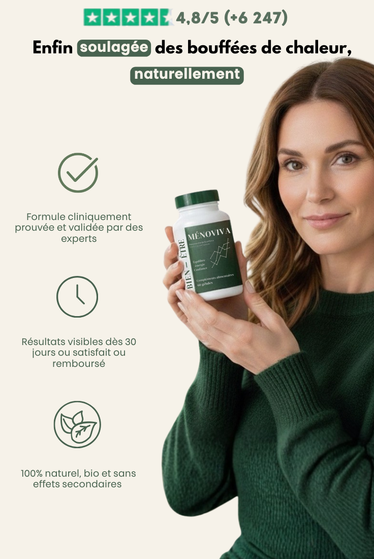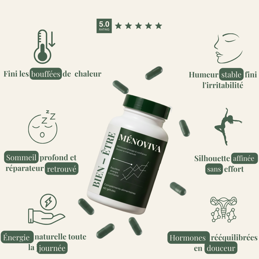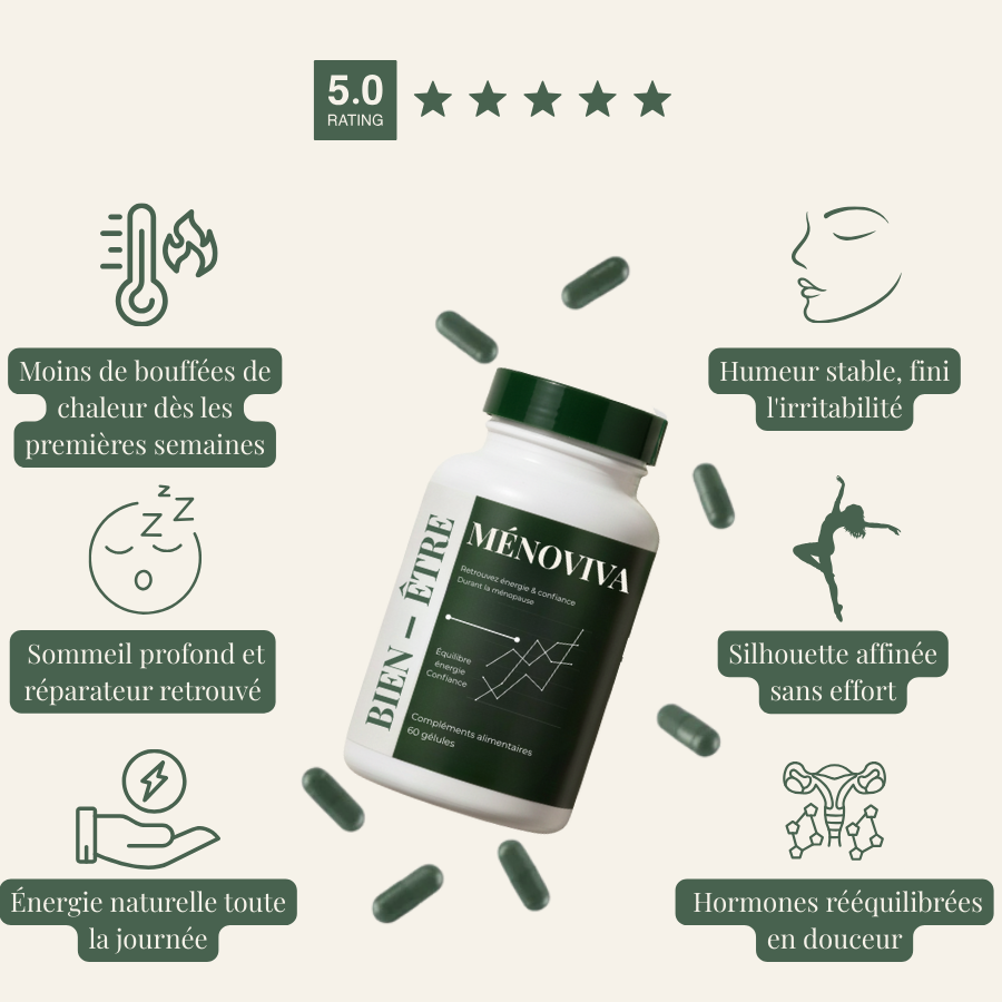 Grâce à sa composition ciblée, Ménoviva aide à réduire les bouffées de chaleur, stabiliser l’humeur, favoriser un sommeil de meilleure qualité, et atténuer la prise de poids liée aux déséquilibres hormonaux. C’est un soutien global, naturel et non hormonal.